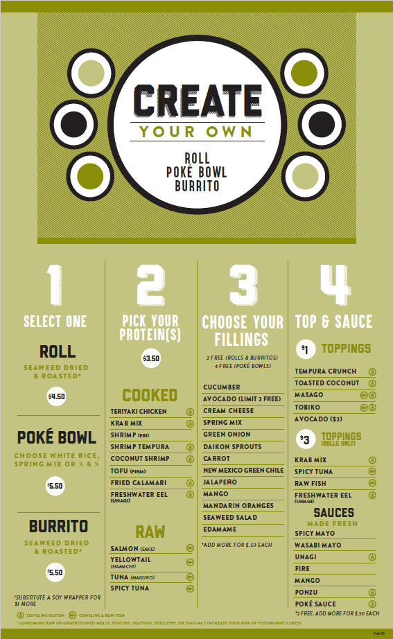 Contains gluten. Seaweed, krab mix, teriyaki chicken, avocado, cucumber, sprouts, jalapeño, spring mix.